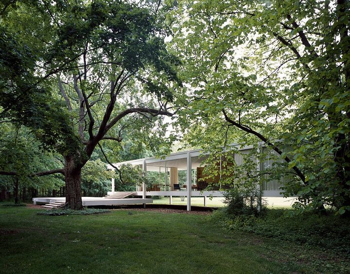 住宅としてはミースが手掛けた最後の作品となる、アメリカ・イリノイ州ブラノに立つ「ファンズワース邸」。エディス・ファンズワース博士の週末の家として緑豊かな場所に1951年に完成した。