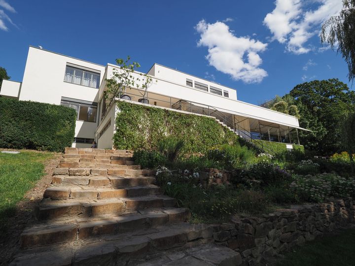 1928〜1930年に実業家夫妻のために当時のチェコスロバキア・ブルノに建設された邸宅。街を一望できる丘の上に建ち、傾斜地に合わせて3階建てで計画された。最大の特徴となるのは、鋼鉄フレーム構造と大きなガラス壁で実現した開放的な空間構成。とくにリビングフロアでは、柱を壁から分離したオープンプランが採用され、壁で仕切られない伸びやかな空間が広がる。また機能主義建築の最高峰とも評され、電動で開閉するガラス窓や空調設備を備えるなど、当時としては画期的な住宅でもあった。