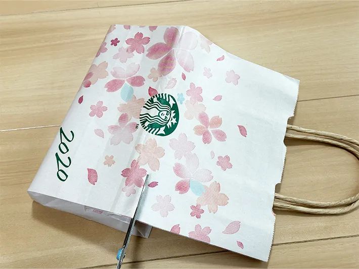 紙袋の上部を横に倒し、はみ出た部分をカットしてください。