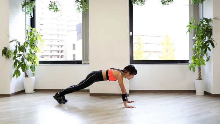 2. 脚を伸ばし、肩からかかとまで一直線にして腕立て伏せの姿勢になります。