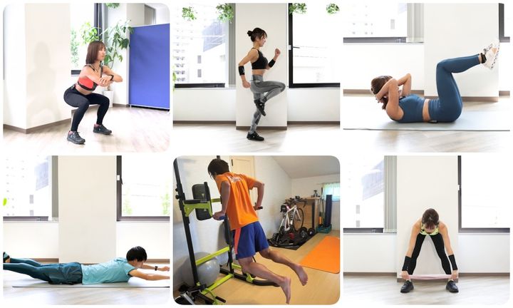 (左上から)スクワット、ゆっくりもも上げ、クランチ