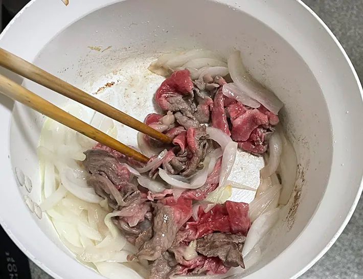 鍋にサラダ油を入れて熱し、タマネギと牛肉を入れます。