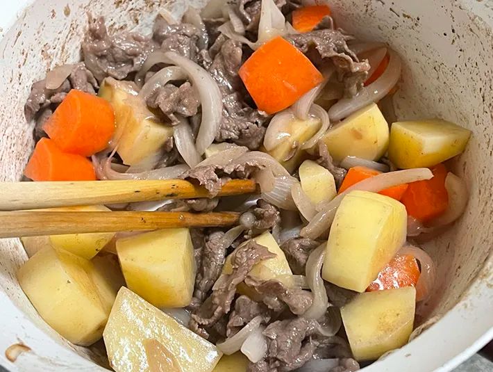 牛肉に火が通ったら、ニンジン、ジャガイモも加えて、炒め合わせます。