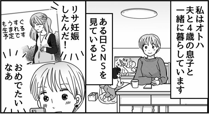 私はオトハ。夫ケイスケ、4歳の息子ヨウタと3人暮らしです。結婚してからライフスタイルもガラリと変わり、昔の友だちとはなかなか会えるタイミングも少なくなってしまいました。特に高校時代に仲良くしていたリサとはSNSで連絡を取るばかりになり、なんだか少し寂しいです。さてそんなある日のこと、リサのSNSの投稿で、リサが妊娠したことを知りました。嬉しい報告を目にした私は、自分まで幸せな気持ちになり、久しぶりに連絡をしてみることにしました。