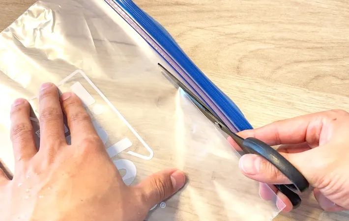 まず、ハサミを使ってジッパー部分を切り取ります。ジッパー部分から上下1cmほどの余白を残すイメージでカットしましょう。