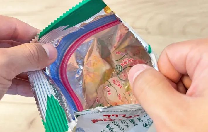 ジッパーつき保存袋のジッパー部分を再利用して、個包装のお菓子の袋をリメイクする方法を試してみました。
