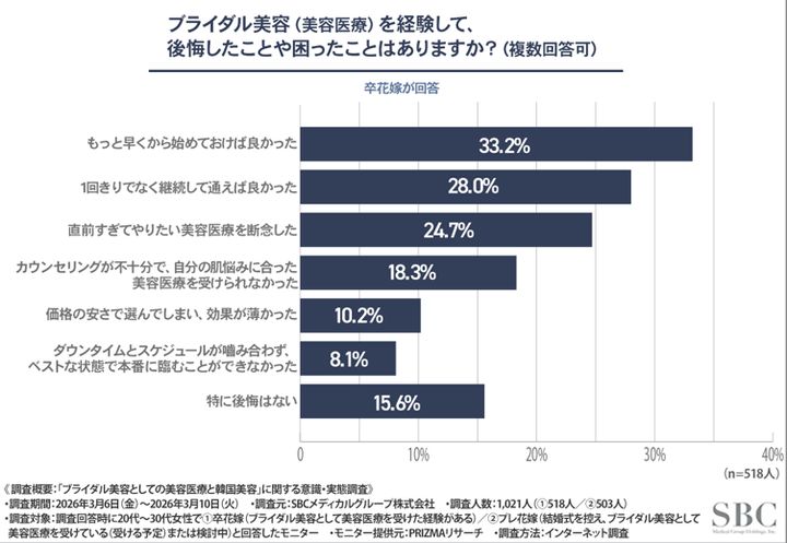 調査で後悔したこととして最も多かったのは、意外にも「もっと早くから始めておけば良かった」(33.2%)という切実な本音。 お肌のサイクルを味方につけ、その魅力を最大限に引き出すには、ある程度の期間が必要なもの。早めのプランニングこそが、理想のコンディションを叶えるための鉄則です。