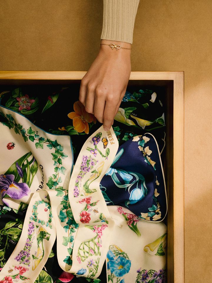 そして、「ハグ ソフト XS」と並んで展開されるのが、象徴的なプリントとフラワーモチーフという、ブランドの伝統を映し出したシルクスカーフとバンドゥのスペシャルセレクション。花々や葉、花びらを繊細に配置し、フェラガモのアーカイブに残るアイコニックなシューズデザインを描いている。