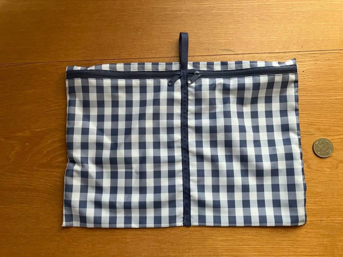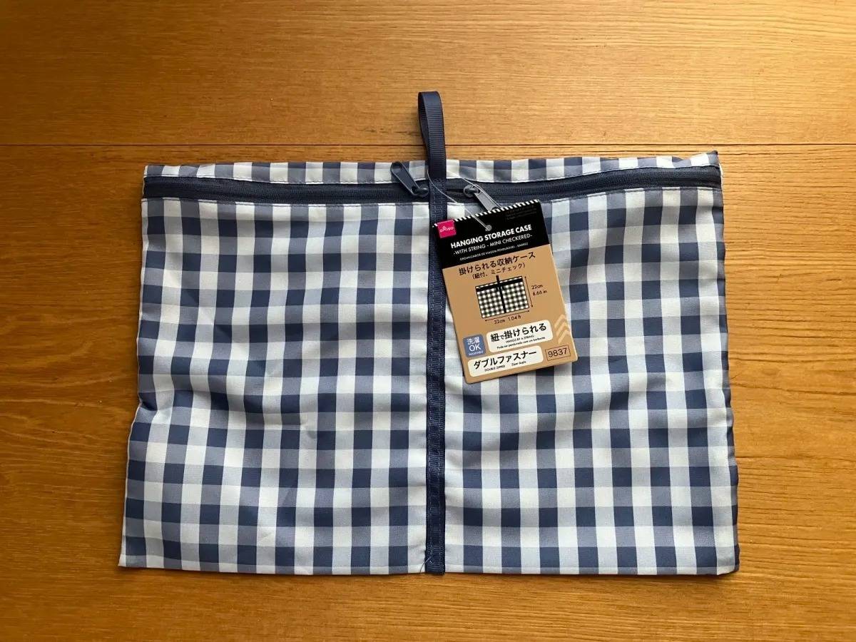 薄手のポーチにループが付いた、DAISO(ダイソー)の「掛けられる収納ケース(紐付、ミニチェック)」♪