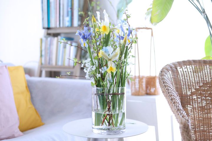 4月の庭や花屋の店先で目を引くアイリス。その魅力は何といっても、天に向かって真っ直ぐに伸びる茎のラインです。今回、フラワー&フォトスタイリストの海野美規さんがご紹介するのは、その「垂直の美」を最大限に引き出すために、円柱形のガラスベースを使ったアレンジメント。小枝を一本通すだけの裏技で、いつものガラスベースが特別なステージに変わります。 春の光にとてもよく映える、アイリスの「青」と「黄」。枝を透かして見せることで空間の余白も楽しむ、自然の力を借りた花留めで、今だけの瑞々しい景色を楽しんでみませんか?