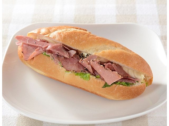 ソフトフランスパンに、パストラミビーフと、レタス、オニオンマリネなどの野菜をトッピング。奥にはハニーマスタード味のマッシュポテトを合わせた、カフェ風ロールサンドです。