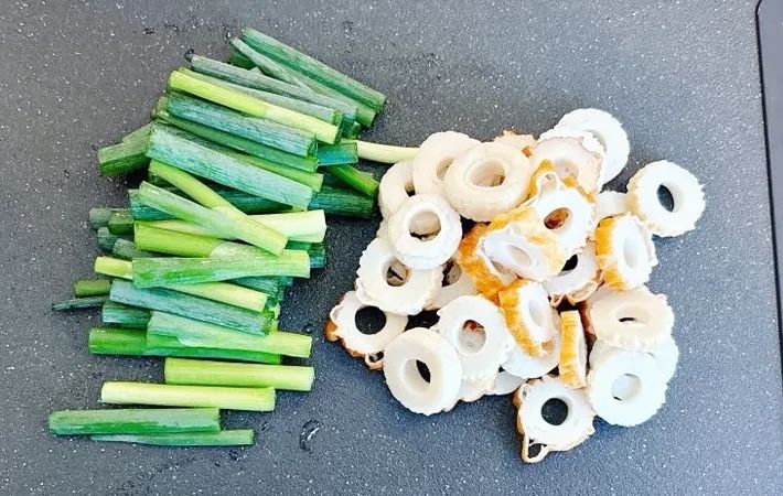 ちくわは薄切り、青ネギは3㎝ほどの長さに切っておきましょう。