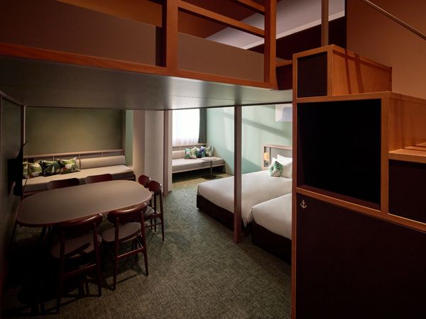 緑は旧市会棟本会議場の絨毯と議員席の色/やぐらスイート(画像提供:OMO7横浜 by 星野リゾート)