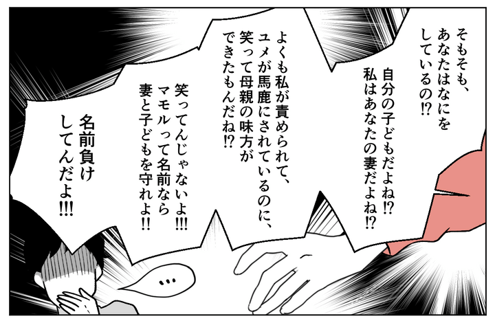 私の怒りの矛先は、自分の母親の暴走を止められない旦那にも向かいます。そう、旦那の名前は「マモル」。名前負けも甚だしいったらありません。