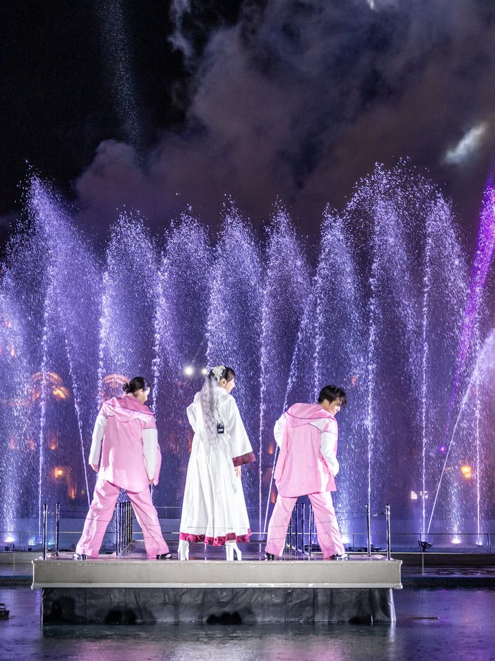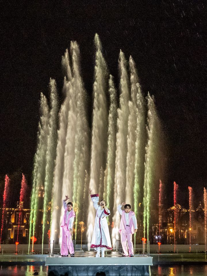 日本初の8Kライドアトラクション「エヴァンゲリオン・ザ・ライド – 8K – 」の誕生を記念し、生歌と噴水、そして光が融合する圧倒的なエンターテイメントを展開。