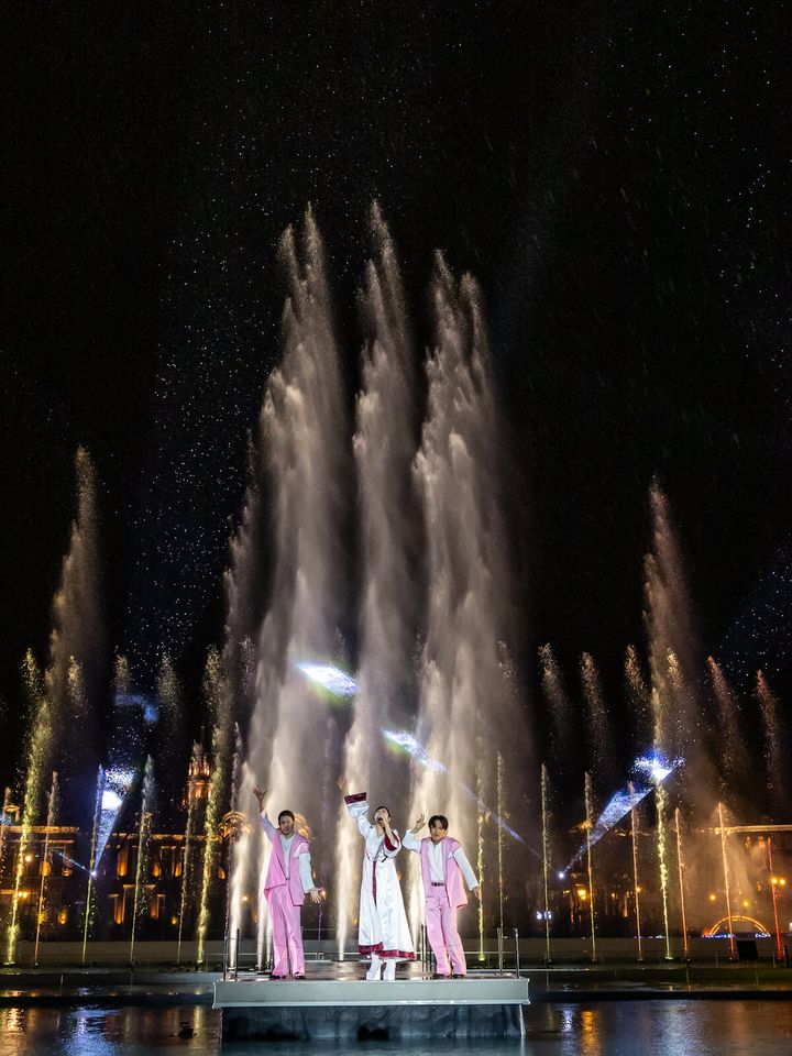 歌手・高橋洋子さんの生歌に合わせ、光の演出とダイナミックな噴水がシンクロする特別なステージです。