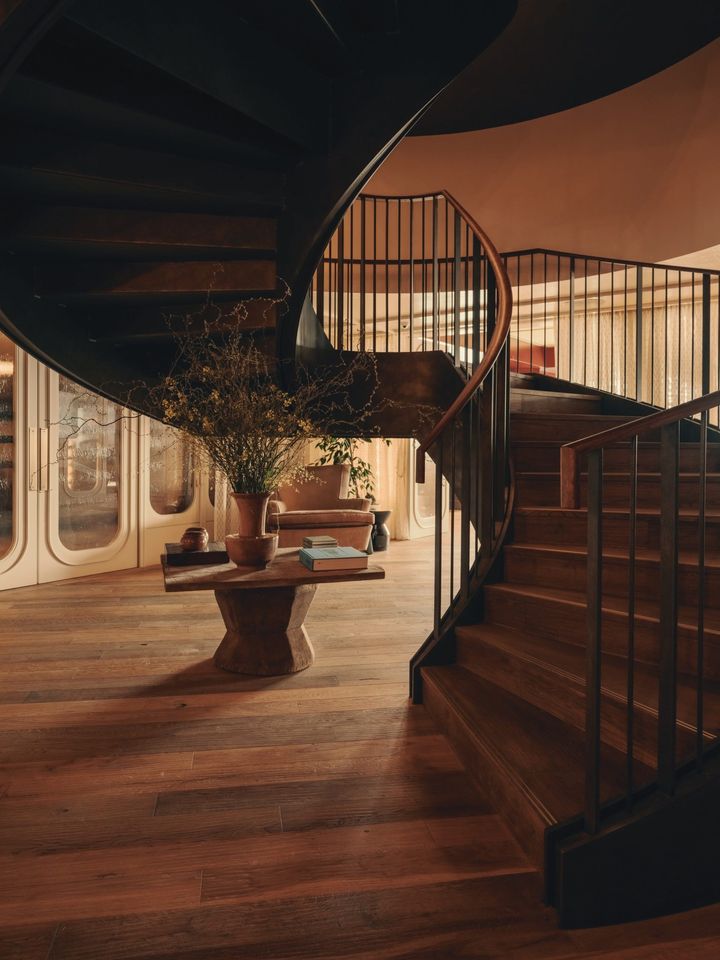プールやバーがある14階と、ラウンジやレストランがある13階をシームレスにつなぐ、象徴的な吹き抜けの螺旋階段。 Edvinas Bruzas