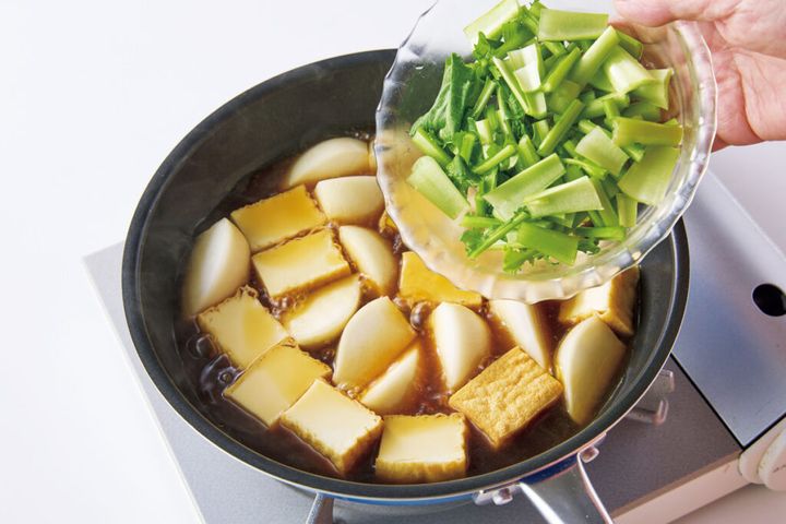3. みりん・酒・醤油を1:1:1で煮るだけ。15分でしみジュワ『厚揚げとかぶの煮もの』