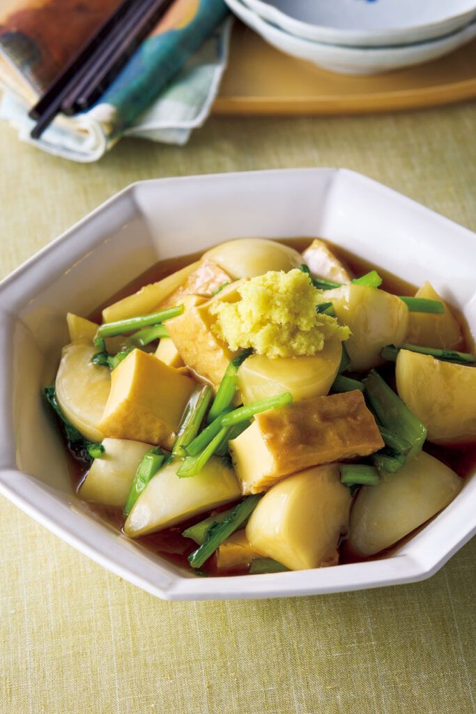 直径24cmのフライパンに〈A〉と厚揚げを入れて中火で煮立て、かぶを加える。再び煮立ったらふたをして弱めの中火にし、2分ほど煮る。中火にしてかぶの葉を加え、1分ほど煮る。水溶き片栗粉をもう一度混ぜて加え、全体を混ぜる。とろみがついたら器に盛り、しょうがを添える。