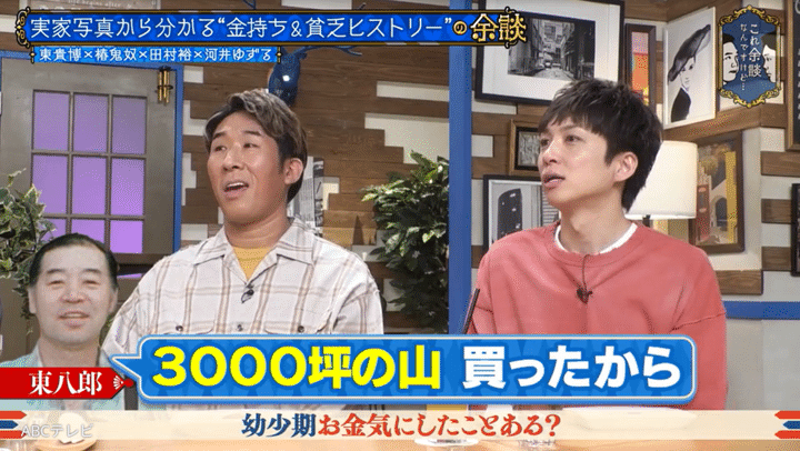 「実家金持ち&貧乏芸人大集合」と題した「これ余談なんですけど・・・」。昭和を代表するコメディアン・東八郎を父にもつ“キングオブ七光りボンボン”東貴博、渋谷育ちの生粋のお嬢様・椿鬼奴、“ホームレス中学生” 田村裕(麒麟)、雑居ビル屋上のプレハブ小屋での極貧生活で知られる河井ゆずる(アインシュタイン)の4人が出演した。