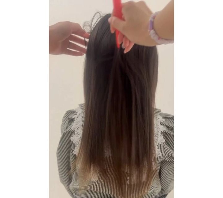 髪がまとまったら、全体の毛をふたつに分けます。