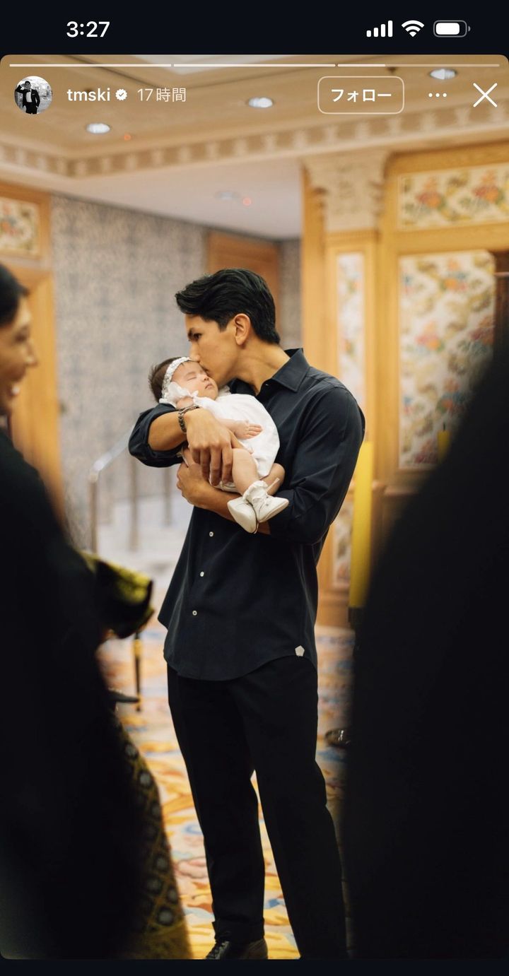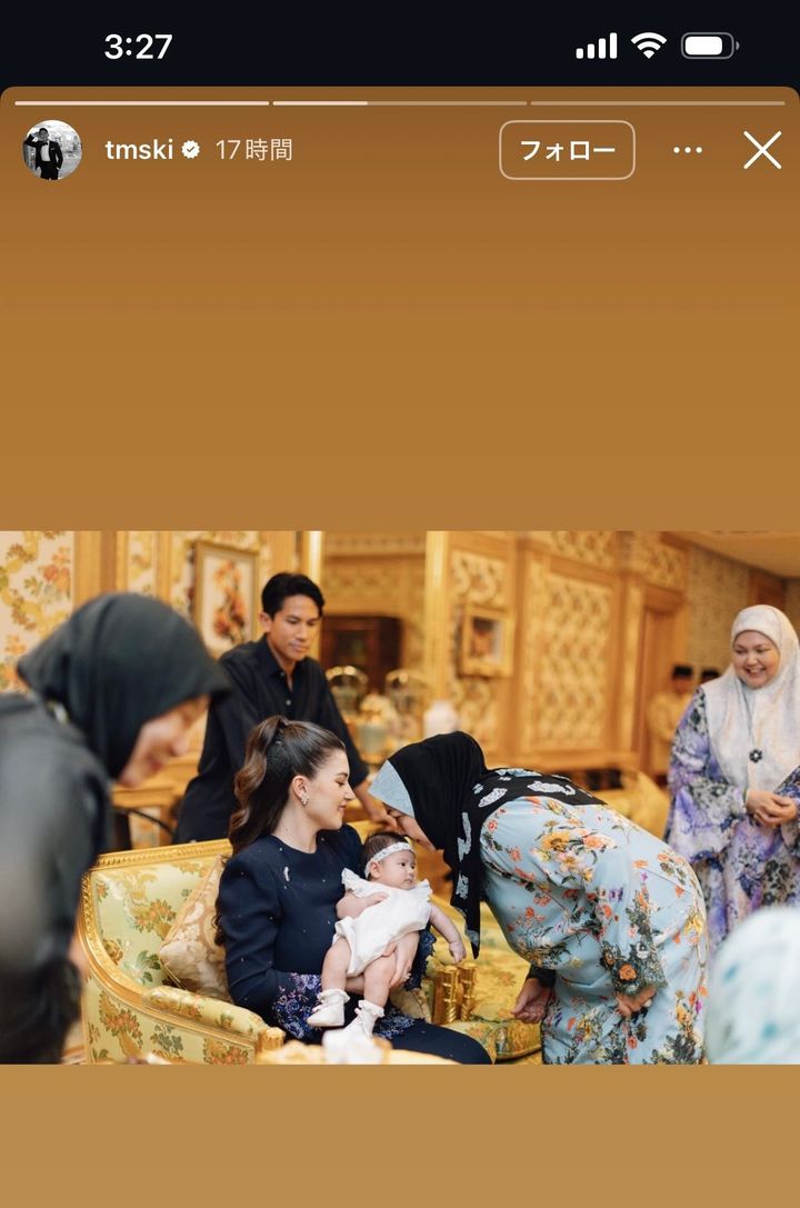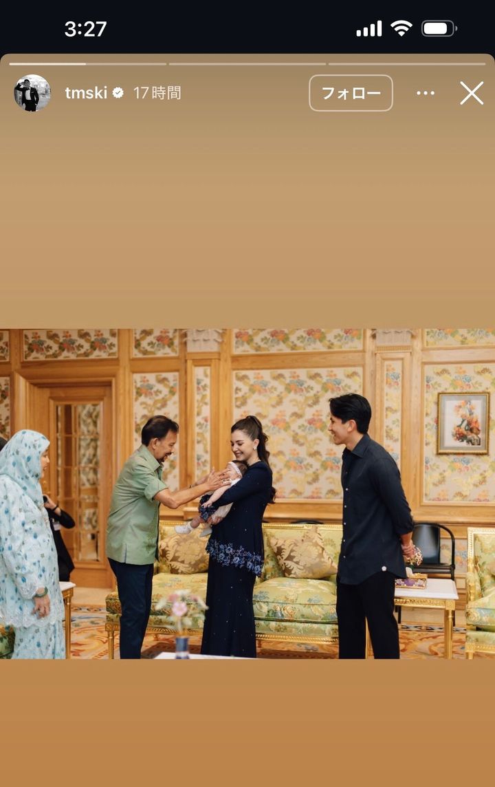 今週インスタグラムのストーリーを更新した王子。現在王子はロンドンの家とブルネイの職場を行ったり来たりしているが、今回は妻子を連れて帰国したよう。父のハサナル・ボルキア国王をはじめとするロイヤルファミリーとザーラ王女の対面シーンを披露した。国王も孫に当たるザーラ王女を前に優しそうな笑顔を見せている。最後には娘にキスするマティーン王子のショットも。