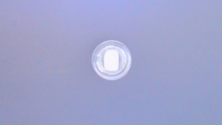 プラスチックの容器2つを用意し、片方にハサミでカットした本品を貼り付け、くっつけてみます。