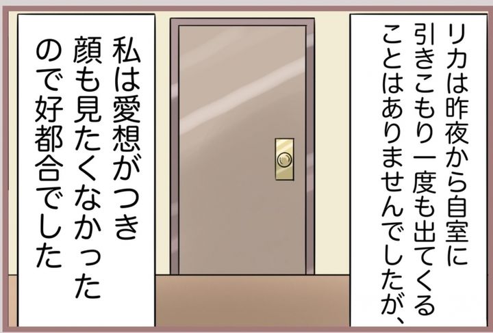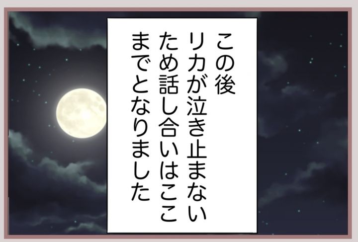 「大学を辞めて家を出ていけ」とリカを突き放す父は、温情で今までリカのために貯めた貯金通帳を渡した。リカはそれでも「お姉ちゃんにだけ学費を払うなんて不公平」と泣いている。