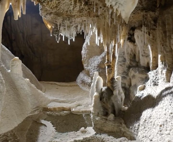 この美しい洞窟の壁をびっしりと覆っているのは、「セレスタイト(天青石)」と呼ばれる硫酸ストロンチウムの結晶です。