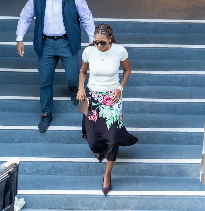 ミシェルが選んだのは、身体にフィットする白Tシャツに、大胆なフラワーモチーフが存在感を放つトリー バーチのスカート。1930年代のタペストリーに着想を得たという鮮やかなフローラルプリントは、赤、緑、青といった彩度の高い色彩が美しく、ニュートラルな装いにエネルギッシュな輝きを添えていた。