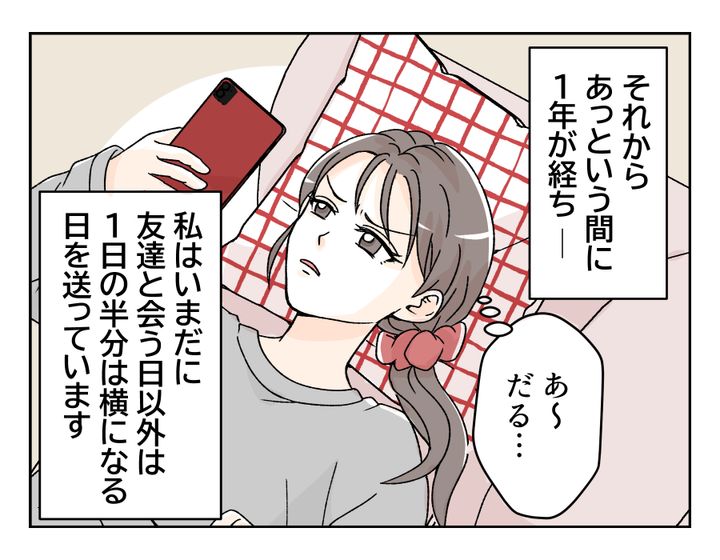 今回の主人公は30代のクルミさん。旦那さんの浮気が原因で離婚し、小学生の子ども2人を連れて実家へ戻りました。しかし離婚のショックから心身ともにバランスを崩してしまい、家事もできず、仕事もできず……1日の半分をベッドで過ごすような毎日をはじめ、1年が経ちました。