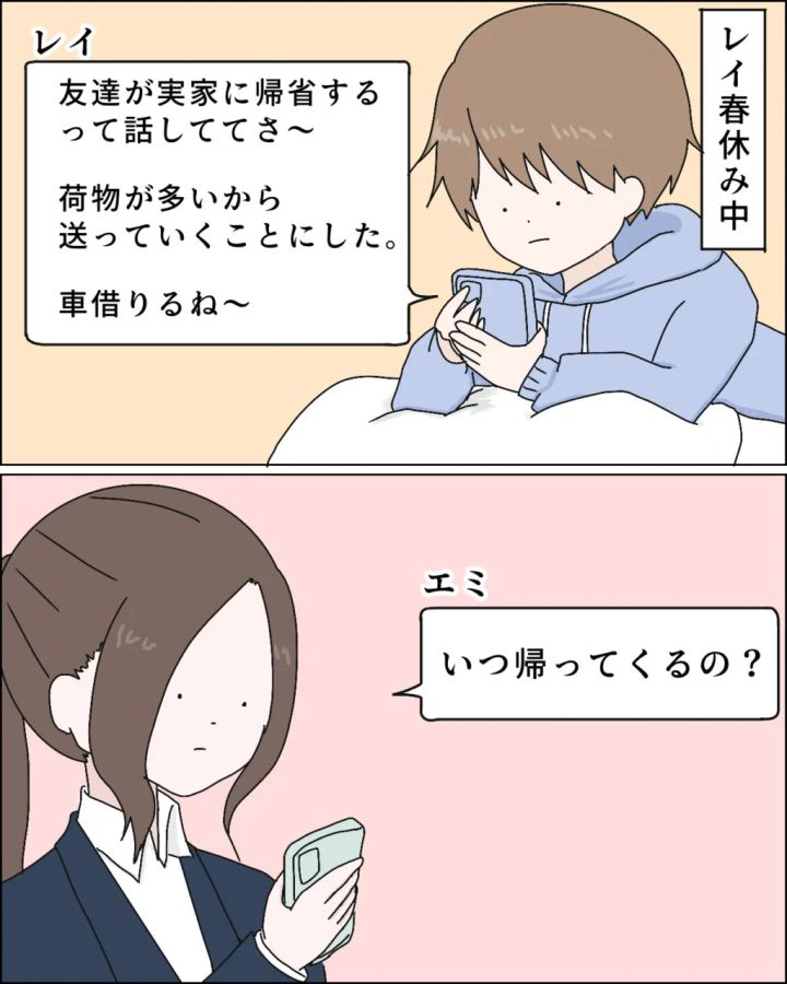 レイが春休みに入ったある日のこと。「友達が実家に帰省するって話してて荷物が多いから送っていくことにした、車借りるね~」と連絡が入りました。車で行けるくらいだから、そう遠くまではいかないだろうと思い「いつ帰ってくるの?」と返信すると・・・