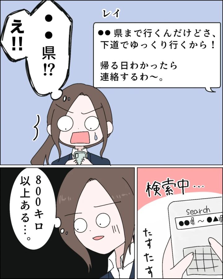行き先は、まさかの〇〇県。私たちが住んでいる場所からは、かなりの距離があるはずです。しかもレイは高速道路を使わず、下道で行くと言っていて帰りは未定。とっさにスマホで距離を調べると、驚くことにここから800キロ以上も離れていることが分かりました。少し心配だけど、下道でゆっくり行くって言ってたし、きっと大丈夫だよね・・・?