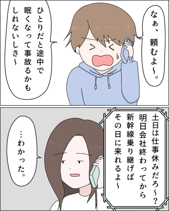 ここまで来てって・・・新幹線を乗り継いでも6時間はかかる場所です。いくら土日が休みでも、仕事終わりに移動するのは正直きつい。私が渋っていると、レイは「頼むよ~、ひとりだと途中で眠くなって事故るかもしれないしさ、明日会社終わってから新幹線乗り継げばその日に来れるよ~」と必死に頼み込んできました。結局押し切られる形で、私はしぶしぶ「わかった」と答えてしまいました。