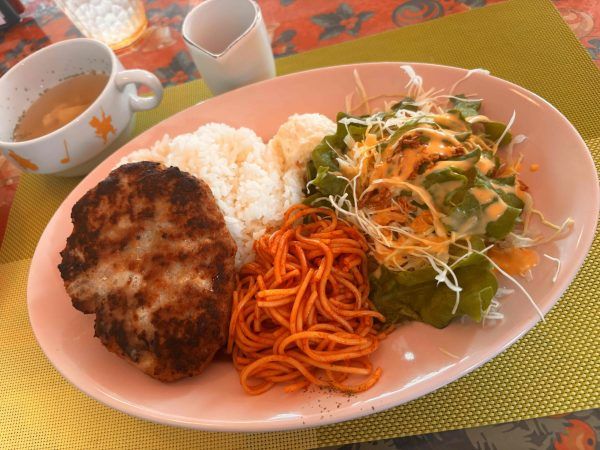 私の胃袋ならば…次回はトリコライスいけそうです!ちなみに、えびピラフ200グラム、とんかつ半分、デミハンバーグ120グラム、タルタル乗せエビフライ1本、ポテトフライ、ナポリタン30グラム、野菜サラダ、目玉焼き、ポテトサラダが豪華ワンプレートと、ボードに解説されておりました。