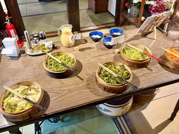 蒸したての湯気の上る野菜たちが美味しそう。 ネギとニンジンとサツマイモは分かるのですが、真ん中の3つは同じ野菜? かと思いきや、かき菜とチンゲン菜など、アブラナ科の種類の異なる菜の花なんだそう。 菜の花は1種類の野菜の名前だと思っていました。勉強になります。