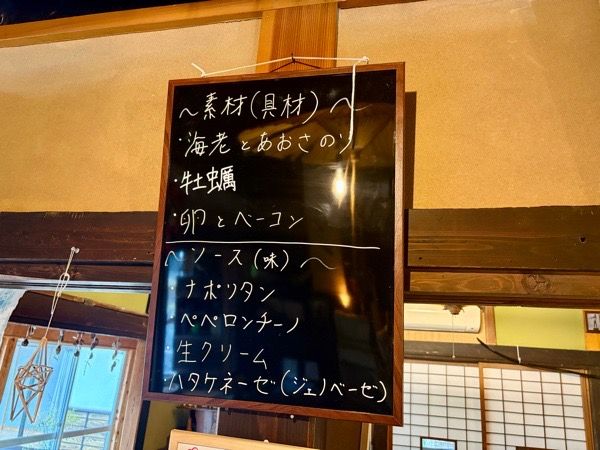 次に素材(具材)とソース(味)を選びます。 なんとなくエビが食べたい気分だったので、海老とあおさのりをチョイス。 ソース(味)は、気になっていたハタケネーゼ。 「艸と手と水」さんでは、店主さんが育てた季節の野菜で作る緑色のソースを総称して「ハタケネーゼ」と呼んでいます。 今の季節は菜の花とのことなので、楽しみー。