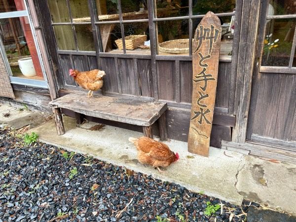 お見送りのにわとりさん。店主さん曰く、とても人懐こいんだそう。