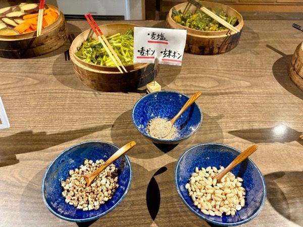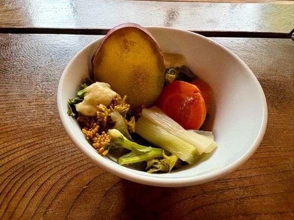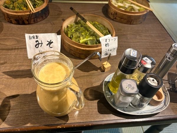 どの野菜も甘い! 菜の花3種はそれぞれ食感や香りが違って、野菜の個性が感じられます。 食べたことのある菜の花は、ほろ苦いイメージでしたが、苦味は全くなくて、すごく食べやすい。 素材の味を感じたくて麦塩をかけた野菜は、香ばしさもあってさっぱりといただける美味しさ。 味変でみそドレッシングも。みその濃厚さと酢の酸味で、野菜の甘みが引き立ちます。 うっかり3回もお替わりして食べちゃいました。