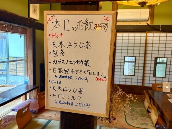 最後にランチセットのお茶を選びます。 どのお茶も美味しそうですが、どうしてもカラスノエンドウ茶が気になって仕方がない。 「マメ科の植物で飲みやすく、煎り立てですよ」と言われたので、是非ともいただいてみたいと注文しました。