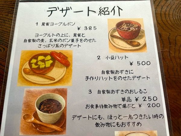 デザートメニューもあります。自家製あずきが美味しそう。 ランチでお腹いっぱいになってしまったので、次回食べてみたいです。