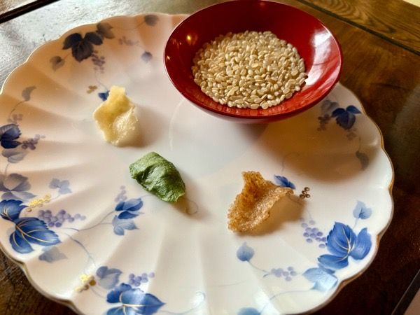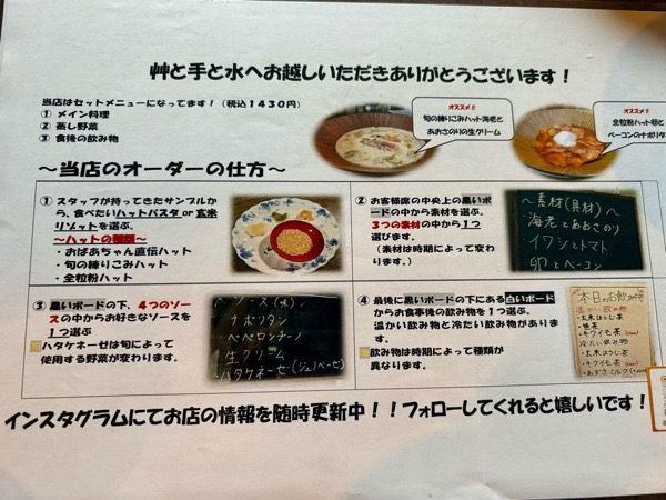 店主さんがハットパスタとリゾットになる玄米のサンプルを持ってきてくれます。 ハットパスタはおばあちゃん直伝ハット、旬の練りこみハット(この日は小松菜)、全粒粉ハットの3種類。 登米名物の「はっと」をアレンジしたハットパスタは「艸と手と水」のオリジナル。 ココでしか食べられないとなれば、やはりハットパスタを選ぶしかないと、全粒粉ハットに決まり!