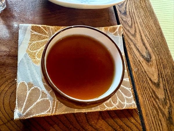 食後のカラスノエンドウ茶。 たしかに豆の風味がします。苦味とかえぐみは全くなくて、ノンカフェインを心がけている身には、新しいお茶との出会いが嬉しい。 着物の帯でできたコースターがカワイイです。