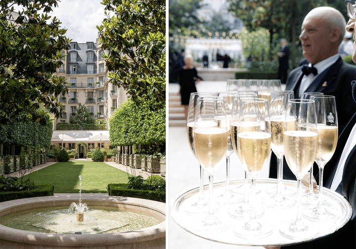 左:公演が行われるのはリッツ・パリの大庭園内にて。 右:シャンパンのRoedererと共に過ごす宵を。photography: 左Angelina Alonzi、右 François Goizé