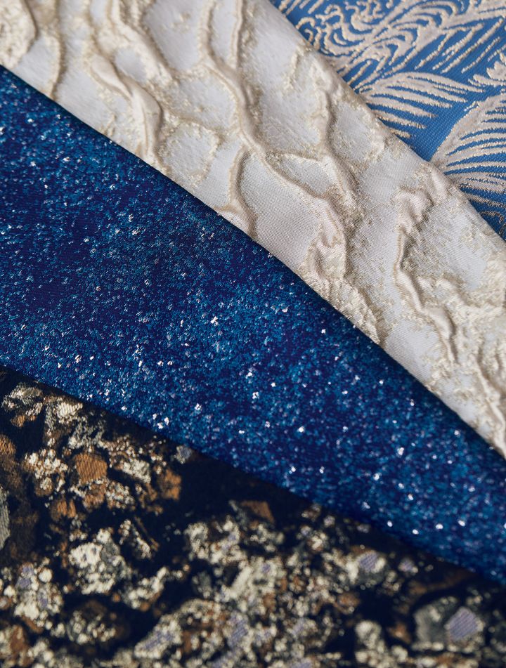 元禄元年(1688年)創業の西陣織老舗「HOSOO」のテキスタイル。絹糸に撚りや金銀箔などの技術を加え生み出される作品は、今や世界中のラグジュアリーメゾンから愛されている。