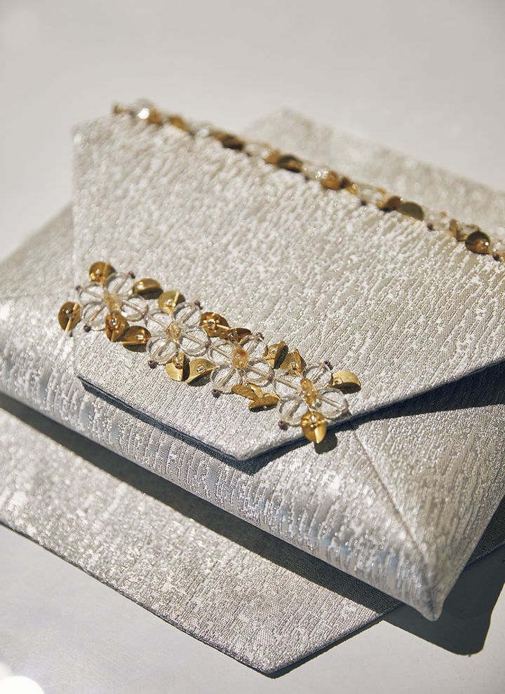山々や大陸の岩盤層に着想して作られた布「Sediment」は、シルクや箔を用いた贅沢な素材。“キモノバッグ”330,000円。