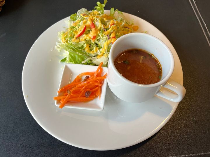 生野菜のサラダ、にんじんのピクルス、スープもついてきました。