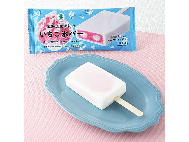 いちごかき氷の中に北海道産練乳を入れ、ミルクアイスキャンディーで包んだアイスバーです。幅広い年齢の方々にお楽しみいただけるよう、クセのない昔ながらの味わいに仕立てました。