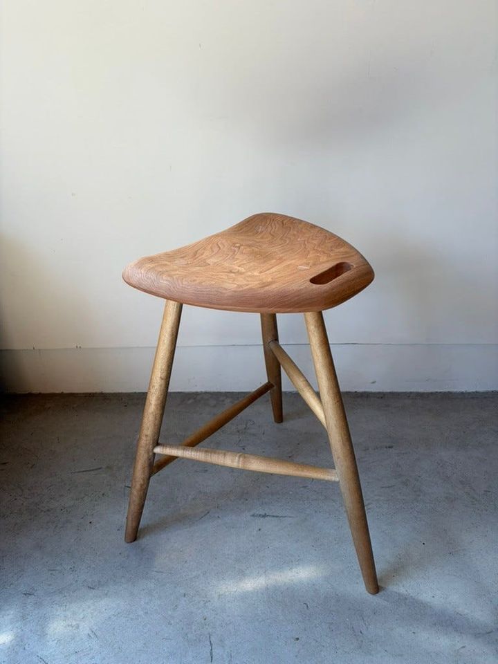 「生活の中にさりげなくあるといいなと思うスツール。そもそも私は、自分のお店でも、お店にうかがったとしても、カウンターが好きでスツール好き。お家の中でもスツールがあると、気軽に座ってこちょこちょ休憩します。しっかり座るより気軽な感じ。部屋にあると、上着を置いたりカバンを置いたり、高さを使ってさまざまな使いかたをします。長年お店で使っていてとても好評だったものを、さらに座り心地よくお尻にフィットするように曲線を加え、引き出すときに持ちやすい取っ手部分もつけたスツールを作りました。これからオプションで、いぐさを巻いたり、真鍮の背をつけたりのシリーズを考えています」