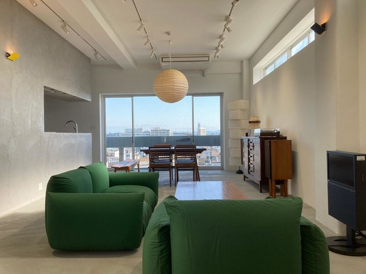 「京都の⾃宅兼事務所で⻑く使っているのが『アルフレックス』の“マレンコ”です。丸みのあるフォルムと包み込まれるような座り⼼地が気に⼊っていて、張り替えをしながら使い続けています。今はグリーンの⽣地にしていて、空間のアクセントにもなりながら⾃然と馴染んでくれるところが気に⼊っています。時間が経っても古くならないデザインで、気づけば⻑く使い続けているソファです」